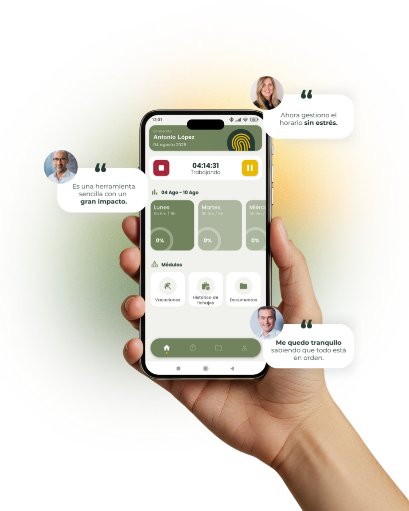 Fichar con el móvil es mucho más cómodo. Me olvido de los papeles y puedo consultar mis horas acumuladas y días de vacaciones en cualquier momento. Es sencillo y me ha facilitado mi día a día.