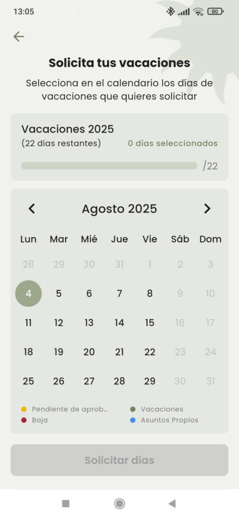 Administra de forma ágil y visual las vacaciones de los empleados de tu empresa. Jornalab permite desde la app solicitar vacaciones, consultar días asignados, vacaciones disfrutadas y gestión de días de asuntos propios.