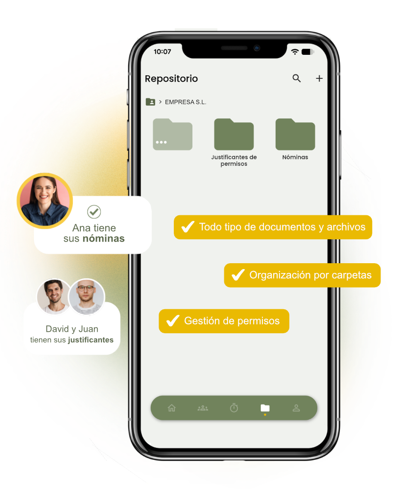Crea tantas carpetas como necesites y define quién puede ver cada carpeta, quién puede subir documentación y qué trabajadores no tienen acceso.